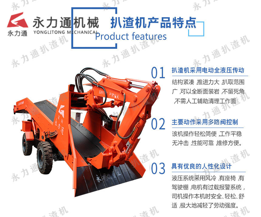 整機(jī)全液壓操作,扒渣更省力毫不費(fèi)勁,動(dòng)作連貫,操作舒適,人機(jī)工程學(xué)原理設(shè)計(jì)可有效減小疲勞程度。